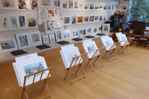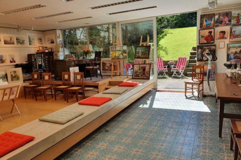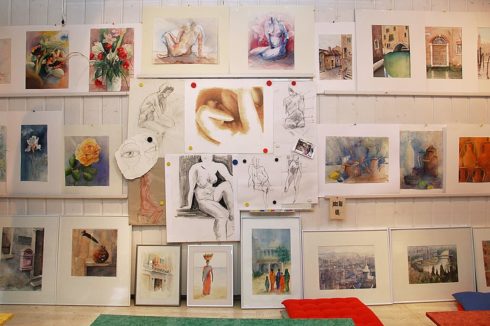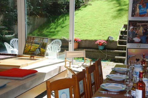 In seinem Atelier arbeitet Ernesto alleine und mit Freunden. Der Donnerstag-Malkreis hat sich den Namen gegeben: „Mahlen und Malen“. Das Foto zeigt den gedeckten Tisch zum fröhlichen Mahl. Weiterhin erfreuen sich wöchentliche Malkurse großer Beliebtheit.